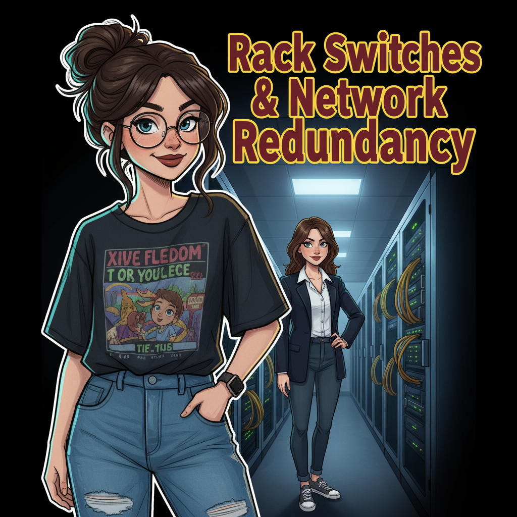 and vintage sneakers, a smartwatch on her wrist; of a woman in professional attire standing confidently in the center of a modern server room. She has medium-length brown hair and wears a white blouse with a dark blazer. The room is well-lit with ambient lighting, featuring organized server racks with glowing network connections and redundant cabling. The text 'Rack Switches & Network Redundancy’ in large, maroon letters with a bright yellow outline is prominently displayed on the wall behind her. The background shows additional server equipment but is not cluttered, maintaining focus on the woman and the reliable infrastructure. The overall atmosphere is professional and technologically advanced, with no explicit nudity or distracting elements.