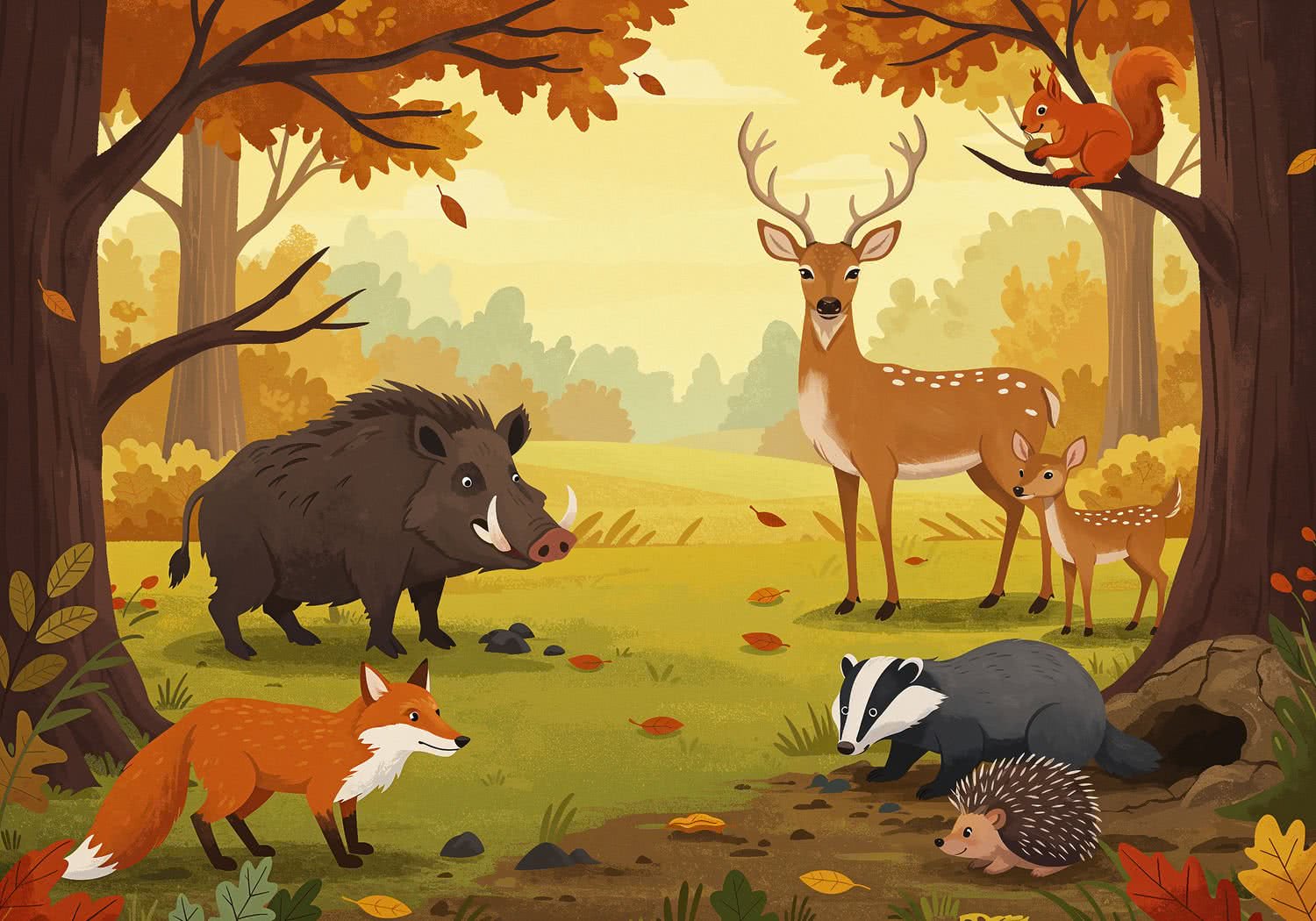 2D vector art: 2D vector art: Create a vibrant, educational illustration in a whimsical style suitable for children, depicting a lush European forest and field scene at dawn with wild mammals showcasing their survival adaptations. In the foreground, a clever red fox with dense, water-repellent fur and sharp teeth crouches stealthily, its large ears perked up; nearby, a majestic noble deer with thick brown fur, branching antlers, and swift hooves stands alert beside a smaller roe deer with spotted camouflage. In the midground, a wild boar with coarse bristly fur, long tusks for digging, and broad hooves roots in the soil, while a badger with gray-black striped fur and curved claws emerges from a burrow. On a tree branch, a red squirrel with fluffy tail and continuously growing teeth gnaws a nut, and at the base, a hedgehog curls into a spiny ball for protection. Highlight fur textures, teeth, claws, and ears in detail to emphasize evolutionary adaptations, with soft sunlight filtering through autumn leaves, evoking wonder and ecology in Western and Central Europe. Use warm earth tones, high detail, and a sense of harmony in nature. 2D vector art, cute whimsical cartoon style, for children’s books,