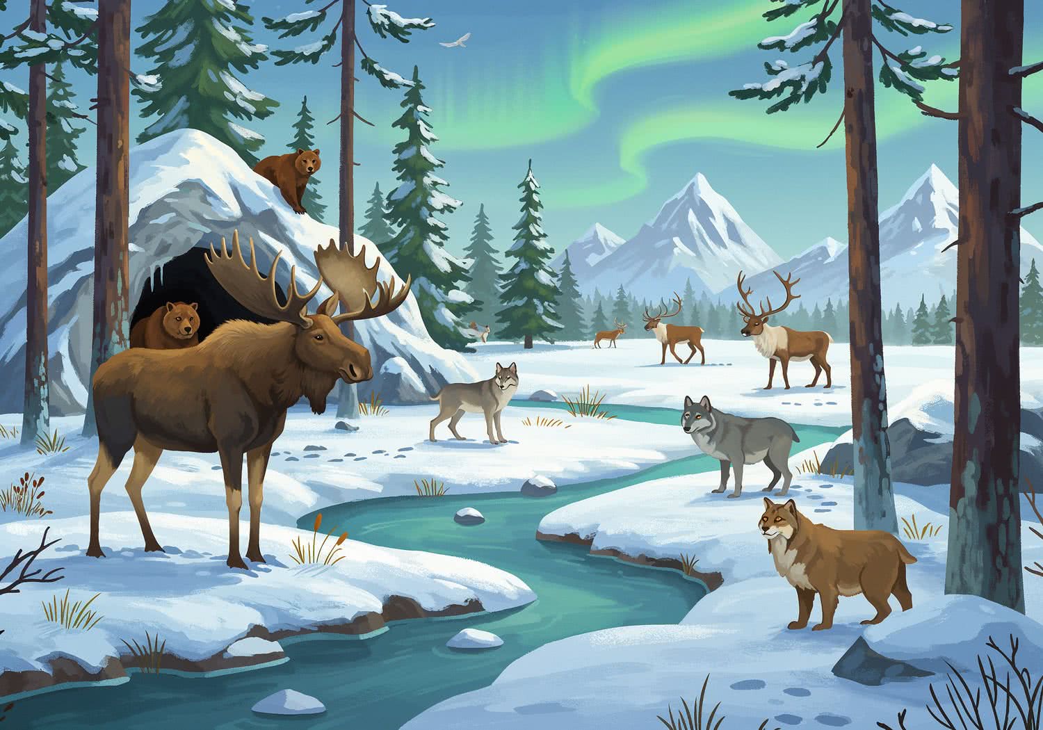 2D vector art: 2D vector art: Create a vibrant, educational illustration in a realistic style depicting the wild animals of Scandinavia in a snowy winter forest landscape. In the foreground, show a majestic moose with large antlers standing alert near a frozen river, while a pack of gray wolves emerges from the trees in the midground, stalking prey under a pale blue sky with subtle northern lights. In the background, include a brown bear emerging from hibernation in a distant cave, a lynx perched on a rock watching silently, and a herd of reindeer migrating across a tundra plain with snow-capped mountains. Emphasize the cold climate with deep snow, evergreen pines, and soft sunlight filtering through, conveying harmony in the ecosystem for a children’s educational blog post. Use cool tones like blues, whites, and grays, with warm accents on the animals’ fur for visual appeal. 2D vector art, cute whimsical cartoon style, for children’s books,