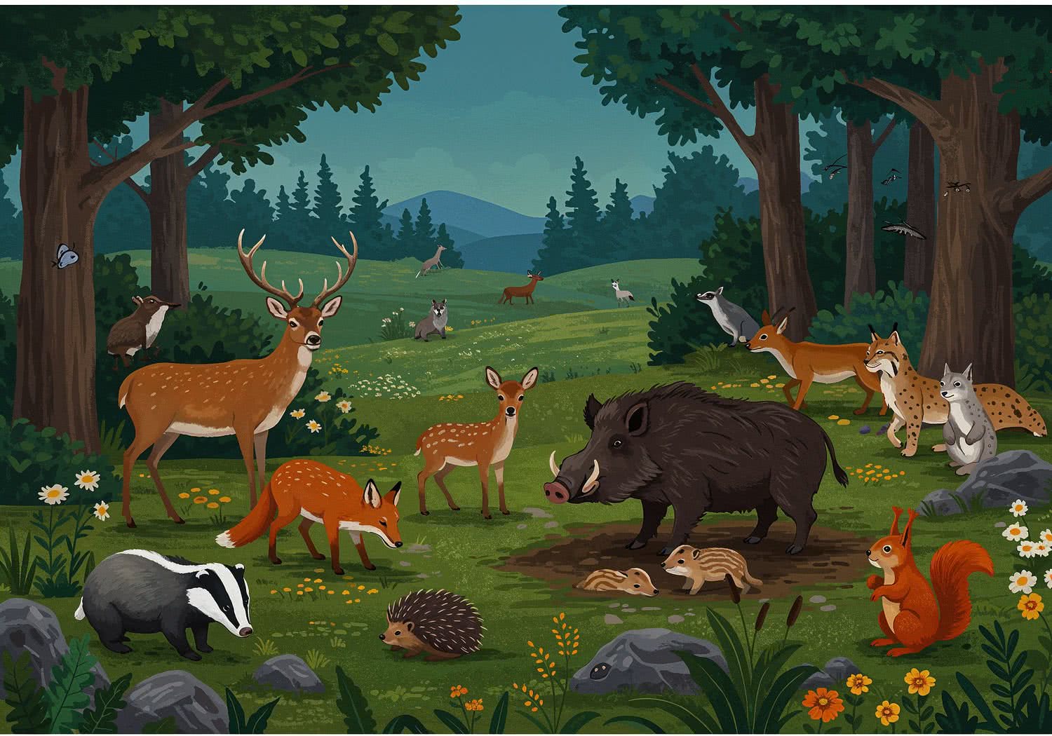 2D vector art: 2D vector art: Create a vibrant, detailed illustration of a lush European forest and meadow at dusk in Western and Central Europe, featuring a diverse group of wild land mammals in harmonious interaction: a majestic red deer with antlers grazing near a smaller roe deer with white rump spots, a clever red fox sniffing the ground nearby, a burly wild boar rooting in the earth with striped piglets, a black-and-white badger emerging from a burrow, a spiky hedgehog curled up, and a red squirrel leaping between trees with acorns. In the background, subtle hints of predators like a gray wolf pack and a Eurasian lynx watching from the shadows, emphasizing ecological balance, with rolling hills, ancient trees, wildflowers, and a soft twilight sky to evoke wonder and education for children and families. Style: realistic yet whimsical nature art, colorful and inviting, in a wide landscape format. 2D vector art, cute whimsical cartoon style, for children’s books,