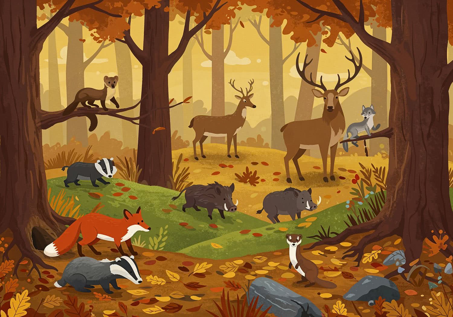 2D vector art: 2D vector art: Create a vibrant, educational illustration in a whimsical style suitable for children, depicting a lush autumnal forest in Western or Central Europe. In the foreground, show a solitary red fox sneaking through colorful fallen leaves and a badger emerging from its burrow in a hillside. In the midground, illustrate a pair of pine martens perched on a tree branch, sharing a watchful gaze, and a small weasel darting after prey near roots. In the background, feature a majestic herd of noble deer led by a stag with large antlers, a family group of wild boars foraging together under oaks, and a wolf pack howling at the moon on a distant ridge. Use warm earthy tones, soft lighting, and dynamic compositions to highlight social structures from solitary to group living, evoking curiosity and nature’s harmony. 2D vector art, cute whimsical cartoon style, for children’s books,