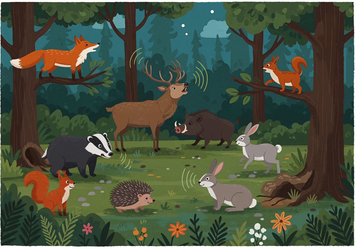 2D vector art: 2D vector art: Create a vibrant, educational illustration for a children’s blog post about the communication secrets of wild land mammals in Western and Central Europe. Depict a lush European forest scene at dusk with diverse animals interacting: a red fox raising its tail and barking alertly to warn others, a majestic stag deer with antlers bellowing a deep roar during mating season, a wild boar grunting while stamping its hooves in a group, a badger standing on hind legs growling near its burrow, a hedgehog curled in a spiky ball hissing, a red squirrel waving its bushy tail while chattering from a tree branch, a hare zigzagging with flattened ears in flight, and a roe deer flashing its white tail flag to signal the herd. Include subtle elements like scent marks on trees and sound waves emanating from the animals to represent sounds and body language. Style: colorful, cartoonish, whimsical, and engaging for preschoolers, with a sense of wonder and harmony in nature. 2D vector art, cute whimsical cartoon style, for children’s books,