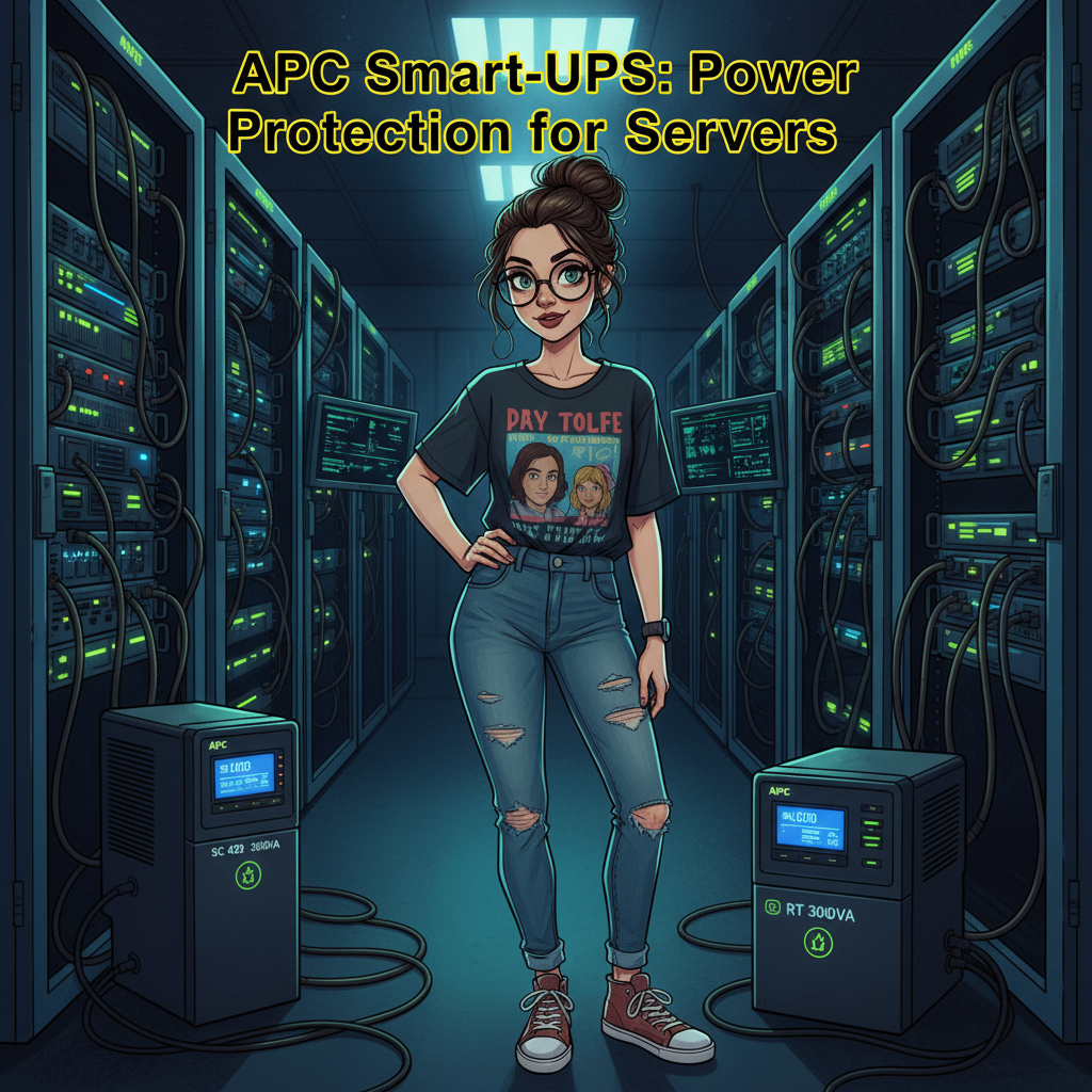 and vintage sneakers, a smartwatch on her wrist; of a woman standing confidently in a modern server room. She is dressed in professional attire, with her hair neatly styled, and is positioned in the center of the image. The room is filled with glowing server racks and APC Smart-UPS units, including models like the SC 420 and RT 3000VA, with digital screens displaying stable power metrics and protection icons. The background features additional server equipment, maintaining a focused and professional atmosphere. The text 'APC Smart-UPS: Power Protection for Servers’ is prominently displayed in large, bold font with a bright yellow outline, ensuring readability and professional presentation. The overall composition emphasizes reliability and data security in a clean, well-lit environment.