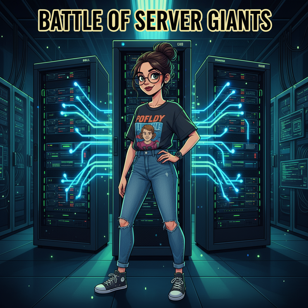 and vintage sneakers, a smartwatch on her wrist; of a woman standing confidently in a modern data center, surrounded by three towering server racks representing Dell PowerEdge, HPE ProLiant, and Fujitsu PRIMERGY. The servers are illuminated with glowing lights and interconnected by streams of data, creating a dynamic and competitive atmosphere. The woman, dressed in professional attire, has a focused expression and is the central figure of the composition. The text „Battle of Server Giants” in large, bold letters with a light yellow outline is prominently displayed above the servers. The background features additional server racks and ambient lighting, enhancing the technological setting without distraction. The overall mood is professional and intense, focusing on the performance and reliability of the server technologies.