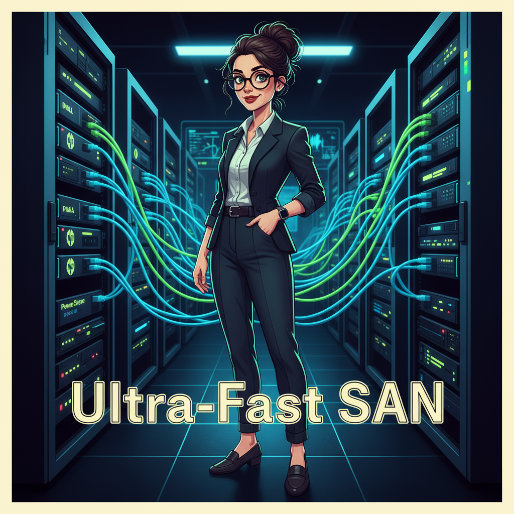 and vintage sneakers, a smartwatch on her wrist; of a woman in a high-tech data center, standing centrally and dressed in professional attire. She is overseeing a network of interconnected server racks featuring Dell PowerStore and HP MSA storage arrays, with glowing fiber optic cables and iSCSI connections symbolizing a scalable ultra-fast SAN infrastructure. The lighting is ambient and cool, highlighting the technology. The text „Ultra-Fast SAN” in large, bold, light yellow-outlined sans-serif font is prominently displayed but does not overshadow the main subjects. The background is softly blurred to focus on the woman and the server racks, maintaining a professional and focused atmosphere without any distracting elements.