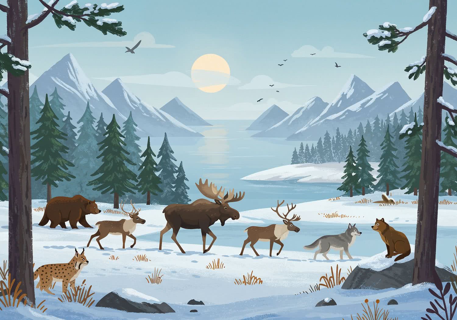 2D vector art: 2D vector art: Create a vibrant, educational illustration for a children’s blog post about wildlife in Scandinavia. Depict a snowy winter landscape of northern Europe with dense forests, fjords in the background, and a vast tundra under a pale blue sky with the midnight sun effect. In the foreground, show a majestic moose with large antlers leading a small herd of migrating moose and reindeer through deep snow, while a pack of gray wolves stealthily follows from the edge of the woods, highlighting their natural predator-prey dynamic. Include subtle elements like a brown bear emerging from hibernation in the distance and a lynx perched on a rock. Use a whimsical, adventurous style with soft lighting, cool tones of white, blue, and gray, and pops of earthy browns and greens to evoke the cool climate and great migrations, suitable for young explorers learning about ecology. 2D vector art, cute whimsical cartoon style, for children’s books,