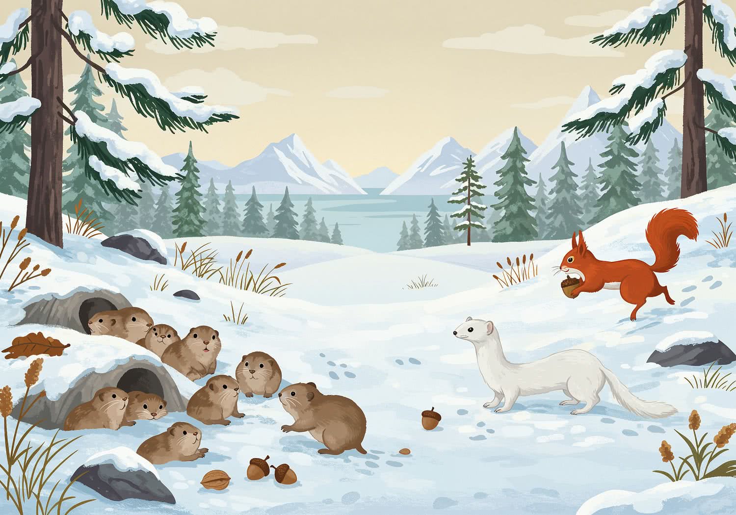 2D vector art: 2D vector art: Create a vibrant, educational illustration in the style of a children’s book, set in a snowy Scandinavian landscape with dense pine forests, tundra hills, and distant fiords under a pale winter sky. In the foreground, depict a lively group of fluffy brown lemmings emerging from interconnected burrows, huddling together and playfully interacting to show communal life. To the right, show a solitary red squirrel with a bushy tail leaping between snow-dusted pine branches, clutching an acorn, emphasizing independence. In the background, illustrate a sleek white-furred weasel stealthily hunting through the drifts, alone but alert. Include subtle details like scattered nuts, tracks in the snow, and a sense of cold but thriving wildlife, with warm colors to engage young explorers. 2D vector art, cute whimsical cartoon style, for children’s books,