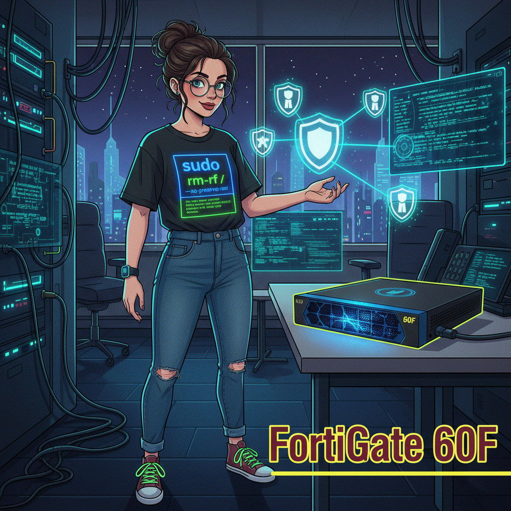 and vintage sneakers, a smartwatch on her wrist; of a woman in a professional business suit, standing confidently in a modern office. She is focused on a network of glowing digital shields she is holding, which are defending against incoming cyber threat icons like viruses and hackers. On her desk, prominently displayed, is a FortiGate 60F device, clearly visible and central to the scene. The text „FortiGate 60F” is displayed in large, bold maroon font with a bright yellow outline in a professional sans-serif typeface. The office background features subtle modern decor and large windows showing a city skyline, with soft, professional lighting enhancing the scene. The overall composition is focused on the woman and the technology, creating a professional and technologically advanced atmosphere without unnecessary distractions.