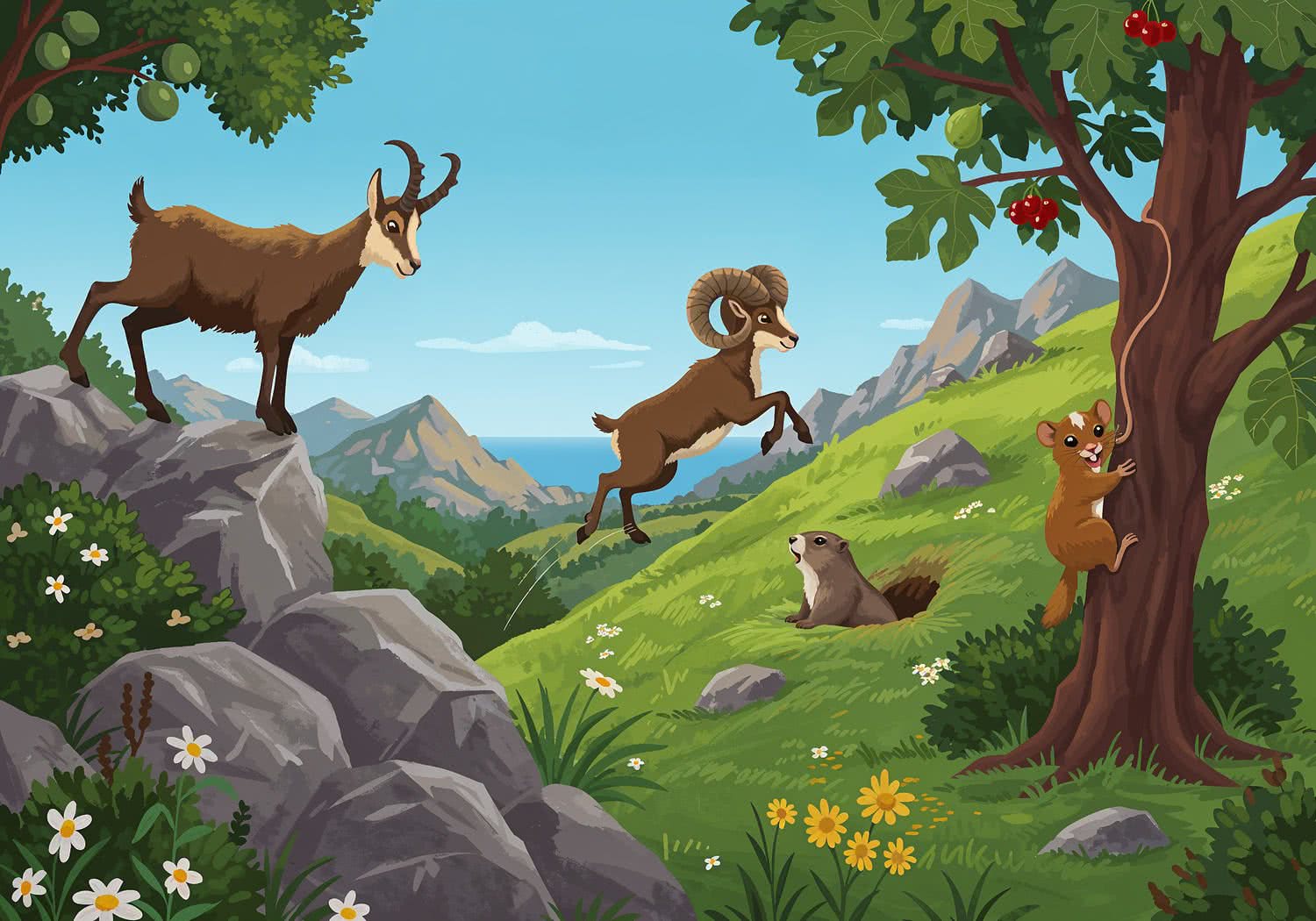 2D vector art: 2D vector art: Create a vibrant, educational illustration for a children’s blog post about wild animals in Europe’s Mediterranean mountains. Depict a sunny, rocky landscape in the Pyrenees or Alps with olive groves and wildflowers in the foreground, under a clear blue sky. In the scene, show a Pyrenean chamois gracefully climbing steep rocks while grazing on green shrubs, a Sardinian mouflon leaping across a hillside with spiral horns, an Alpine marmot peeking from a burrow on a grassy slope whistling alertly, and an edible dormouse climbing a fig tree at dusk nibbling berries. Include seasonal elements like blooming spring flowers and distant sea views to evoke the warm climate, in a whimsical, colorful style suitable for kids, with animals looking curious and harmonious in nature. 2D vector art, cute whimsical cartoon style, for children’s books,