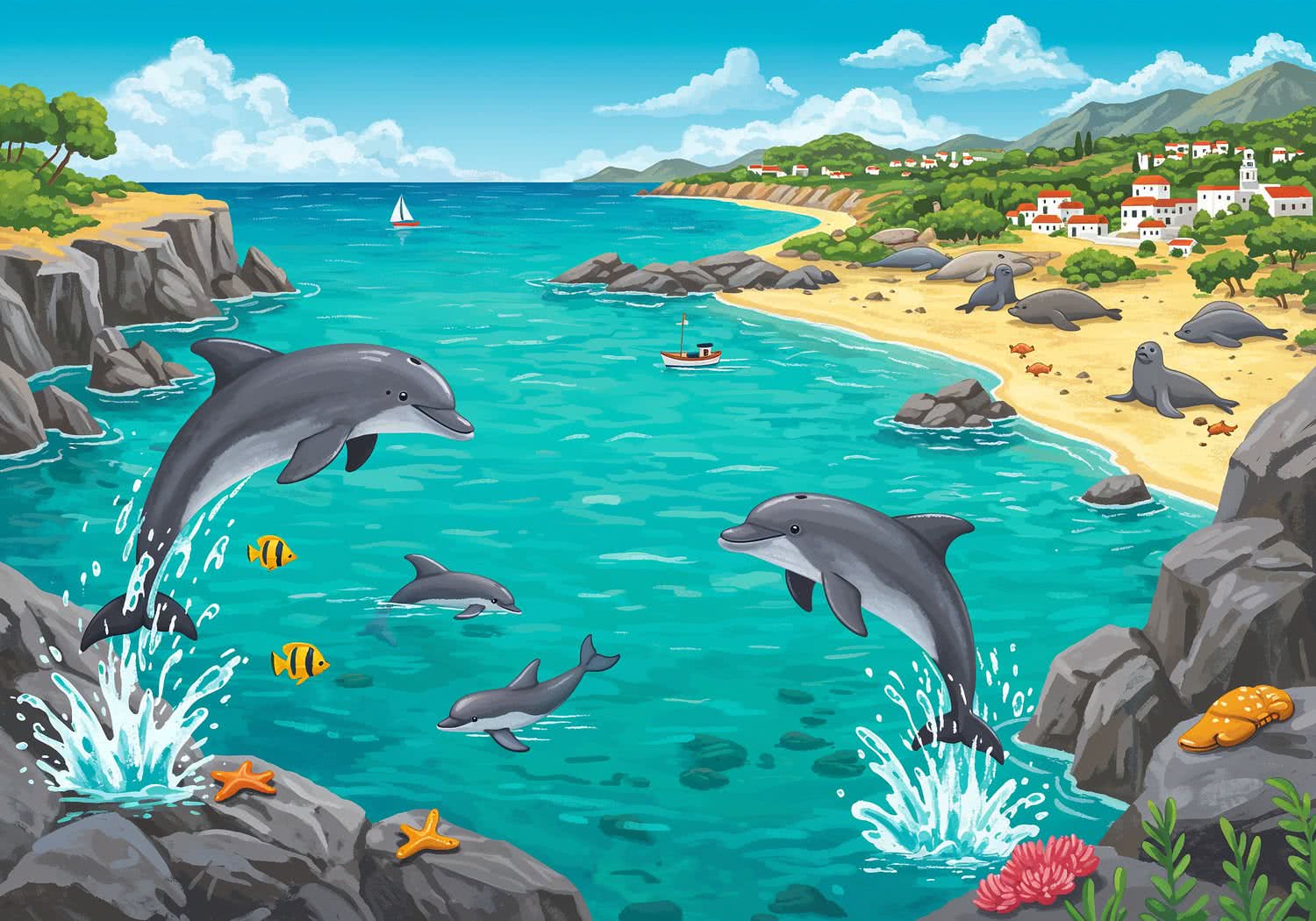 2D vector art: 2D vector art: Create a vibrant, educational illustration in a whimsical style suitable for children and families, depicting the Mediterranean Sea’s coastal wonders in southern Europe. In the foreground, show bottlenose dolphins playfully leaping out of the turquoise waters near rocky cliffs, with a harbor porpoise subtly swimming below. In the background, include monk seals lounging on sunlit rocky shores of a Greek island like Crete, and a few Antarctic fur seals on a sandy beach, surrounded by clear blue seas, olive trees, and distant whitewashed villages under a bright sunny sky. Emphasize themes of marine life, territories, and conservation with subtle elements like fish schools, sea grass meadows, and protective bubbles or sounds visualized as wavy lines. Use warm colors like blues, golds, and greens to evoke the Mediterranean climate, in a detailed yet approachable digital art style. 2D vector art, cute whimsical cartoon style, for children’s books,