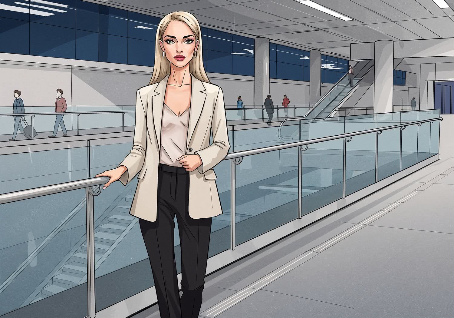 Woman presents the following topic to the viewer: A bustling international airport terminal with crowds of travelers rushing through, featuring sleek stainless steel railings and large tempered glass panels as durable barriers along escalators and walkways, highlighting their strength against luggage impacts and heavy foot traffic, in a modern architectural style with natural light streaming in. ;;