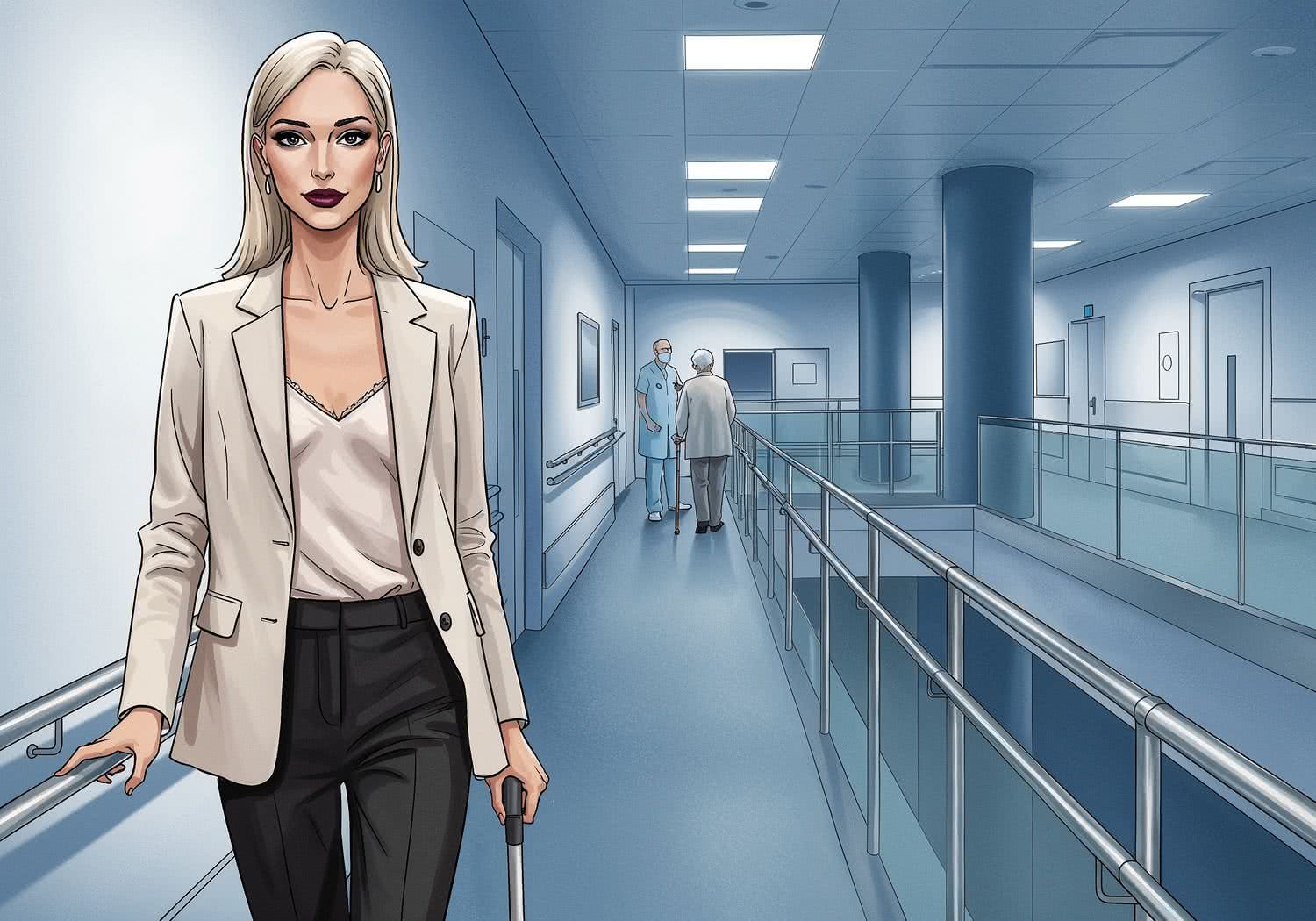 Woman presents the following topic to the viewer: A highly detailed, realistic illustration of a modern hospital corridor featuring sleek stainless steel handrails and protective barriers mounted along the walls. An elderly patient with a cane grips the smooth, shiny steel railing for support while walking steadily, with a nurse assisting nearby. The environment emphasizes hygiene and safety: spotless white floors, soft lighting, medical equipment in the background, and subtle highlights on the corrosion-resistant steel surfaces to convey durability and aseptic qualities. Render in a professional, photorealistic style with cool blue and white tones for a clean, clinical atmosphere. ;;