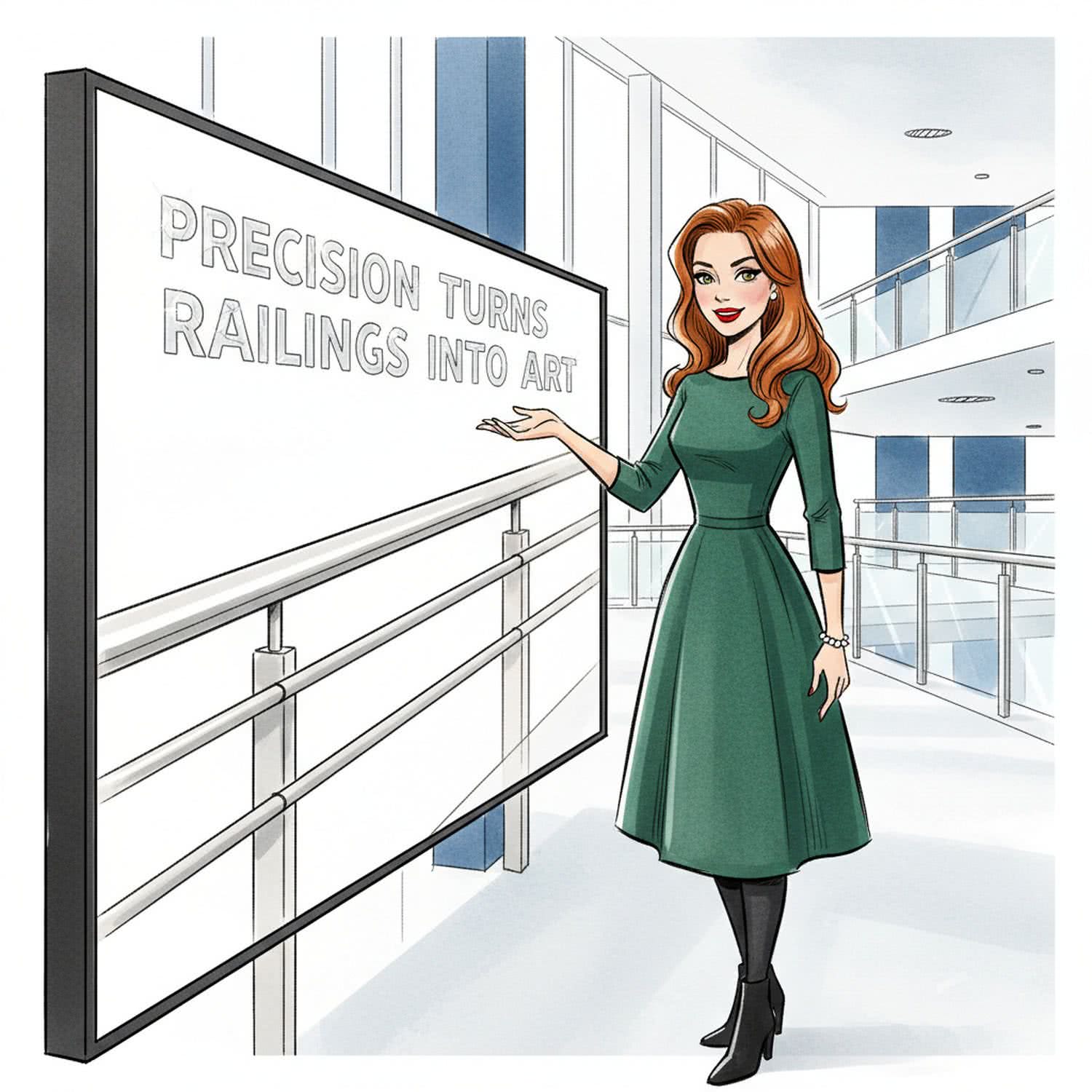 Woman presents the following topic to the viewer: A sleek, modern stainless steel balustrade railing in a contemporary architectural space, showcasing precise welds that blend seamlessly like a monolith, smooth satin-finished surfaces reflecting light elegantly, and perfectly aligned pipe connections for stability and harmony, close-up details highlighting craftsmanship turning functional safety into artistic beauty. The text reads: 'Precision Turns Railings into Art’, rendered in large, modern font with letters cut from glass, evoking high-end glazing craftsmanship. ;;