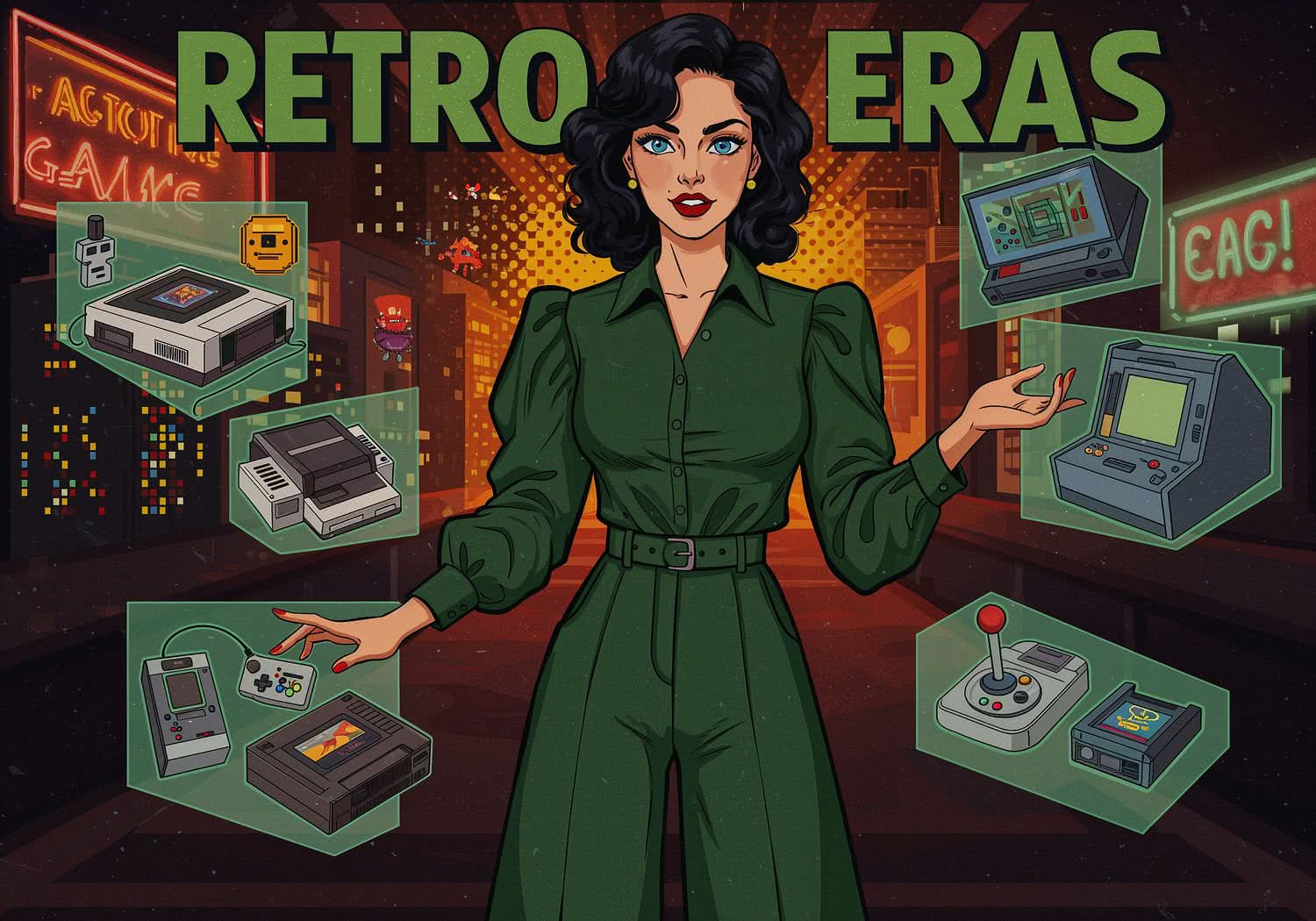 Woman presents the following topic to the viewer: A vibrant retro-style illustration depicting the evolution of video game consoles across bit eras, with a woman standing in the center as a passionate collector surrounded by floating holographic displays of iconic consoles like the Atari 2600, NES, SNES, PlayStation, N64, and Dreamcast, transitioning from pixelated 8-bit sprites on the left to immersive 3D arcade worlds on the right, in a nostalgic arcade room filled with glowing cartridges and joysticks. The text reads: 'Retro Bit Eras’ in large font with dark green fill, thick yellow outline, styled as a 1950s comic book typeface. ;Background is artistic vision of dark noir comic style drawing.