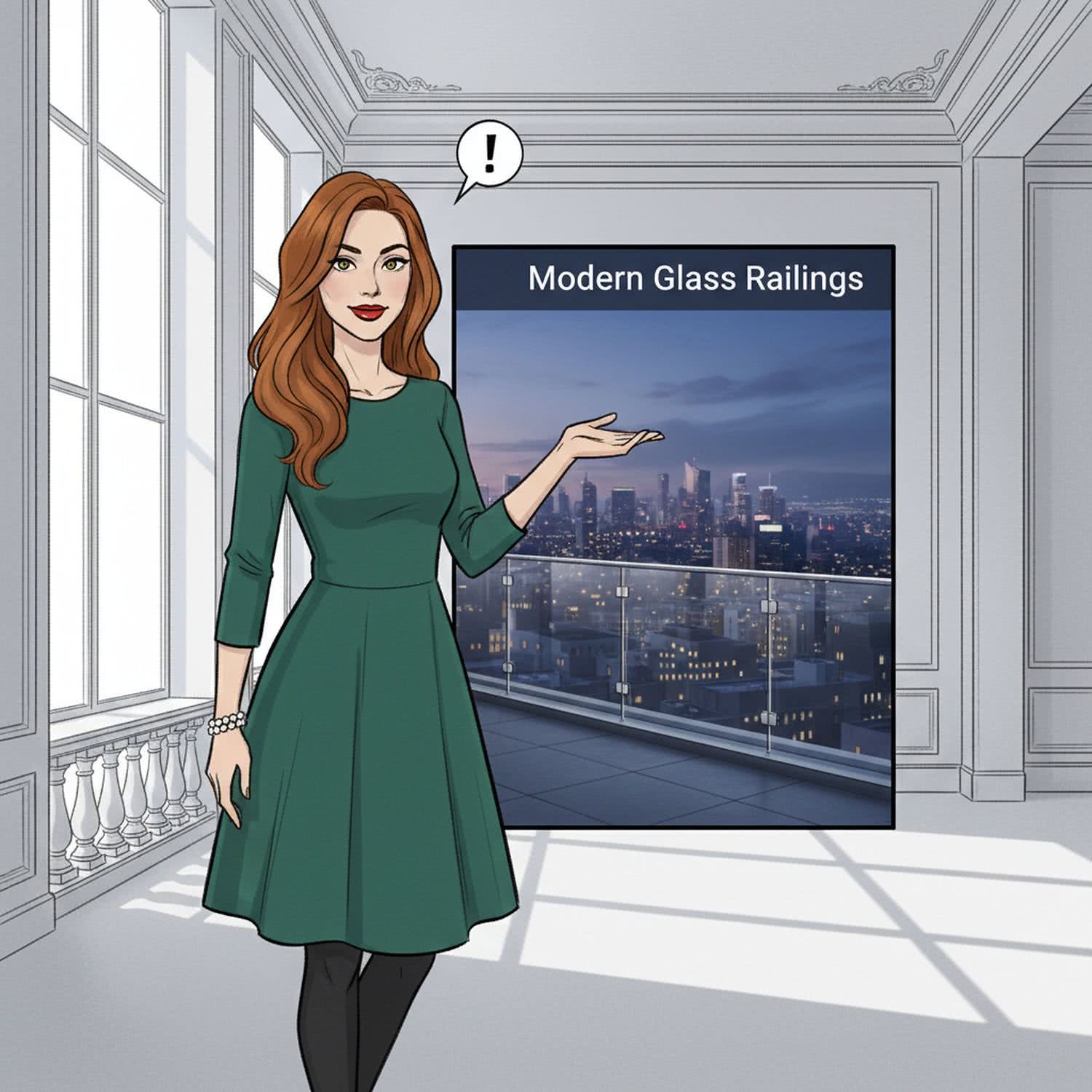 Woman presents the following topic to the viewer: Elegant modern glass railing on a sleek outdoor balcony overlooking a cityscape at dusk, featuring transparent tempered and laminated panels with subtle steel supports, emphasizing strength, clarity, and aesthetic integration with architecture. The text reads: 'Modern Glass Railings’ ;;