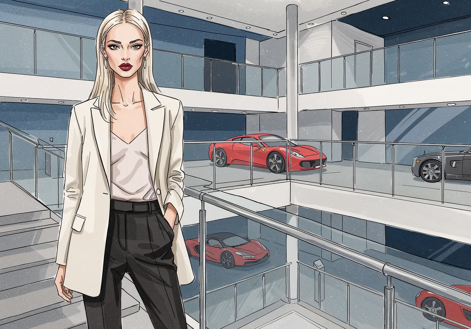 Woman presents the following topic to the viewer: A luxurious car showroom interior with wide, modern staircases featuring sleek balustrades made of polished stainless steel frames and large, transparent tempered glass panels, overlooking gleaming premium vehicles like a red Ferrari and a black Rolls-Royce on the lower level, soft LED lighting reflecting off the shiny surfaces, evoking prestige and exclusivity, high-end architectural design in a spacious, open gallery-like space. ;;