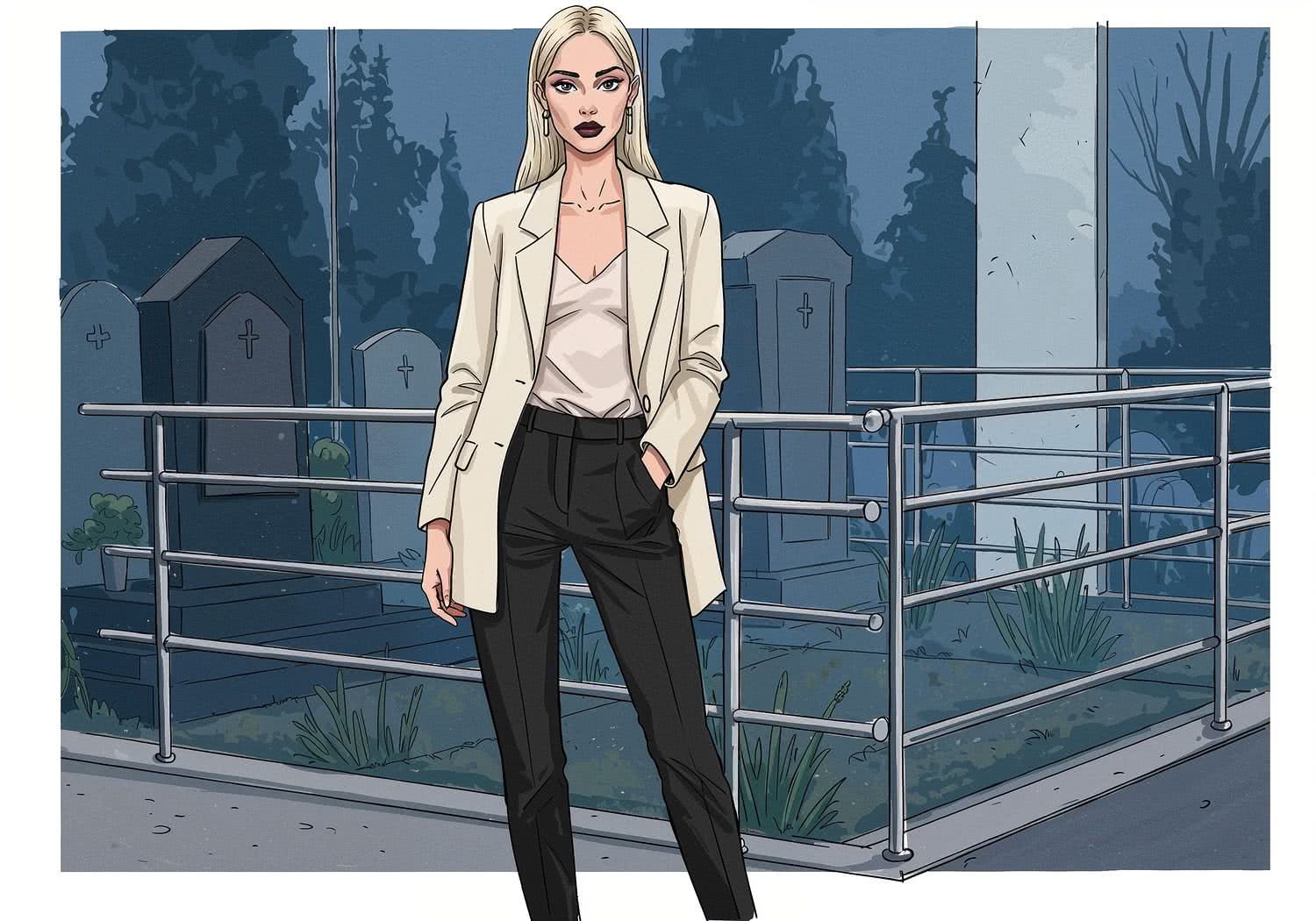 Woman in a tailored cream blazer, a delicate silk camisole underneath, fitted black trousers, and high heels, silver minimalist earrings;