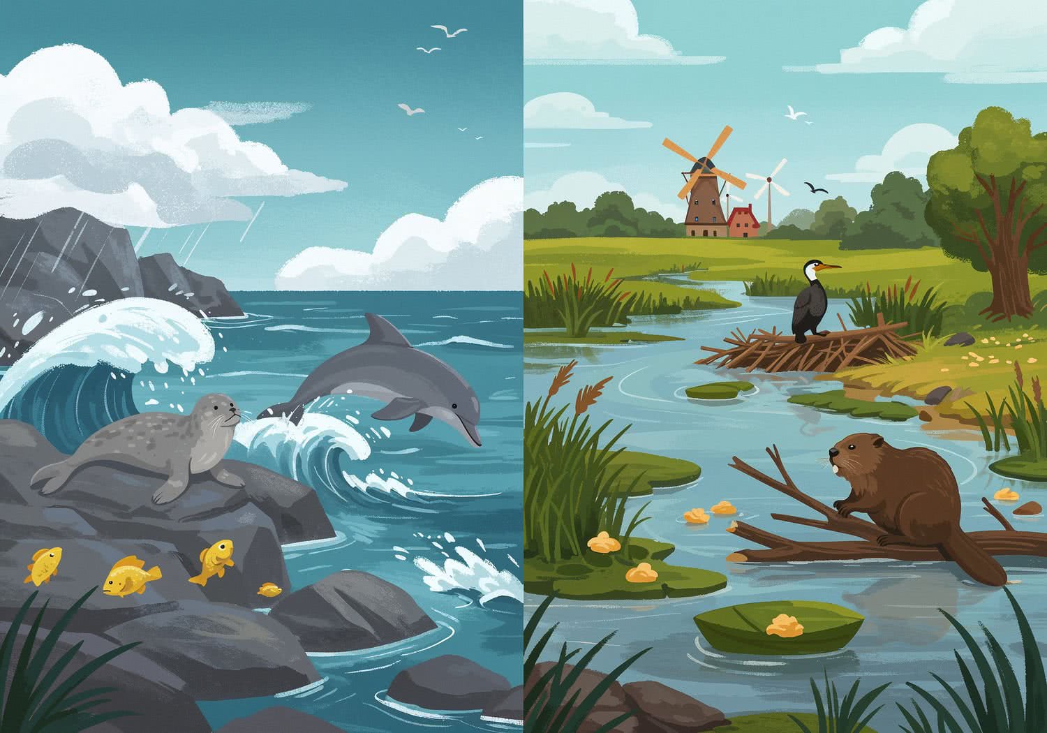 2D vector art: 2D vector art: Create a vibrant, educational illustration for a children’s blog post about wild aquatic and marine mammals in Western and Central Europe. Depict a scenic European landscape split into two halves: on the left, the stormy North Sea coast with a gray seal (Halichoerus grypus) lounging on rocks, a bottlenose dolphin (Tursiops truncatus) leaping from waves, and an otter (Lutra lutra) swimming in a nearby river; on the right, a calm Central European river like the Rhine with a European beaver (Castor fiber) building a dam from branches, surrounded by lush wetlands. Include subtle ecological elements like fish, birds (e.g., herons and cormorants), and distant landmarks such as windmills in Holland and forests in Germany. Use a colorful, cartoonish style suitable for preschoolers, with friendly animal expressions, soft lighting, and a sense of adventure and harmony in nature, emphasizing conservation themes. 2D vector art, cute whimsical cartoon style, for children’s books,