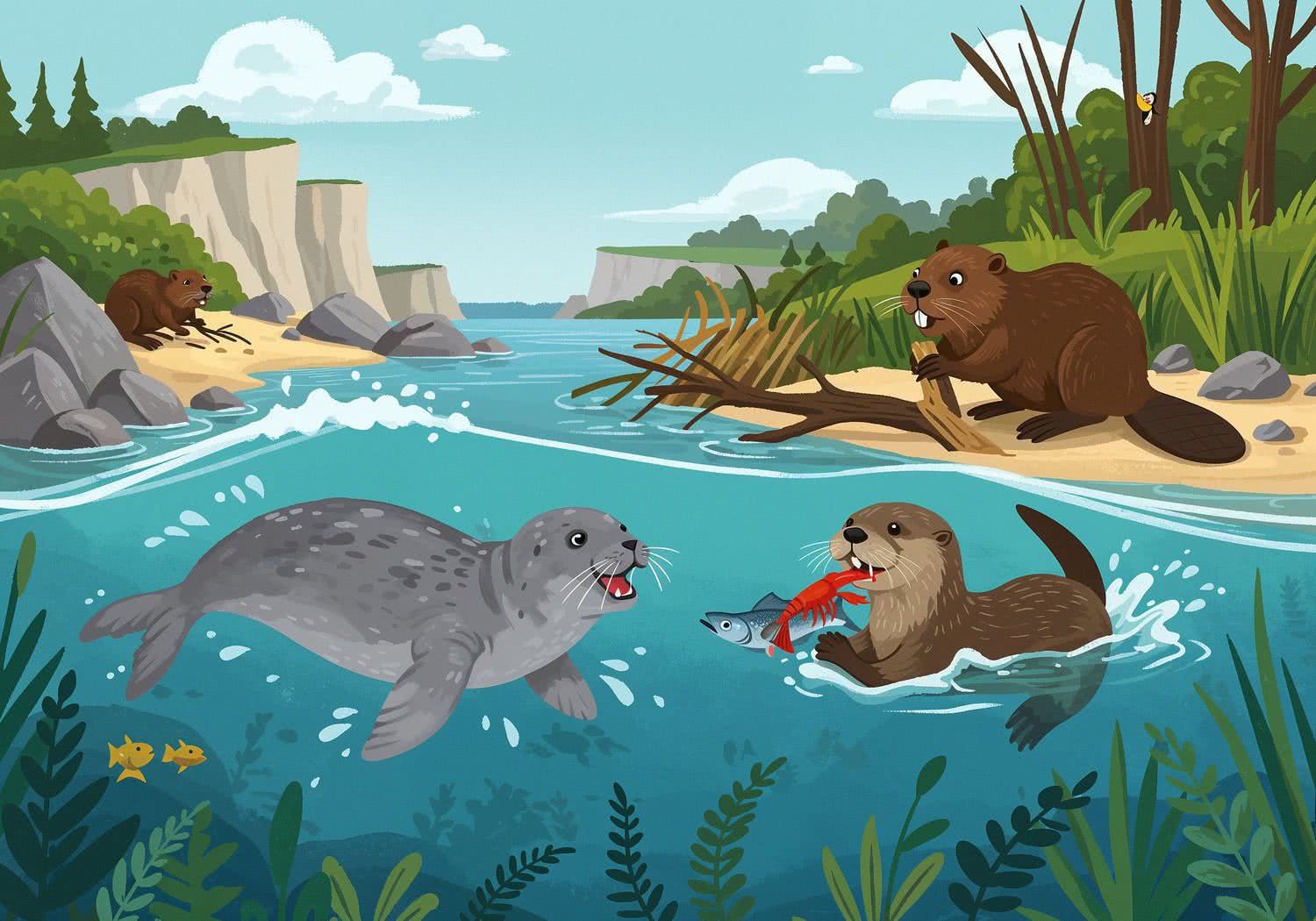 2D vector art: 2D vector art: Create a vibrant, educational illustration for a children’s blog post about European aquatic mammals and their survival adaptations. In the foreground, depict a grey seal diving in the cold Atlantic waves off the UK coast, showcasing its thick, oily fur with water beading off the outer layer and fluffy undercoat visible, plus sharp conical teeth catching a slippery fish. In the midground, show a playful river otter in a Central European river like the Oder in Poland, with ultra-dense waterproof fur, curved claws gripping a crayfish, and small rounded ears sealed against water, mid-swim. In the background, illustrate a beaver in a German river building a dam with branches, highlighting its orange iron-reinforced incisors gnawing a tree trunk, paddle-like webbed claws, and coarse outer fur over soft inner layer. Use a colorful, whimsical style with soft blues and greens for water, rocky shores, and forests, including subtle ecological elements like clean beaches and protected habitats to emphasize conservation. Include diverse European landmarks subtly in the distance, like cliffs or bridges, aimed at kids aged 4-8, in a dynamic underwater-to-surface composition. 2D vector art, cute whimsical cartoon style, for children’s books,
